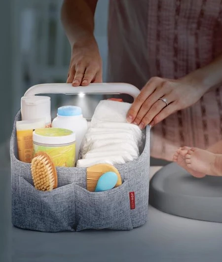 Faites la lumière sur les changements de couches au milieu de la nuit avec notre porte-couches moderne ! La poignée brille doucement avec une lumière sensible au toucher et une fonction d’arrêt automatique de 10 minutes. Organisez les couches, les lingettes et plus encore avec un diviseur modulaire et quatre poches.