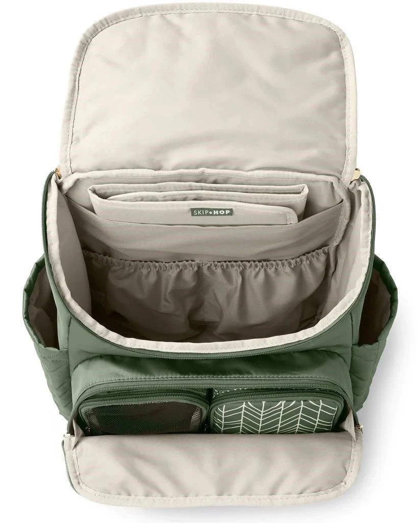 Le sac à dos léger et matelassé offre plusieurs poches de rangement pour les essentiels de bébé. L’intérieur spacieux permet de ranger tout ce qu’il faut, du goûter aux tenues de rechange, et l’ouverture extra-large permet de trouver facilement les éléments essentiels en cas de besoin. Le compartiment avant comprend 2 compartiments de rangement multi-usages et permet un stockage supplémentaire. Tout reste à portée de main grâce aux poches intérieures élastiques et aux poches latérales isolées pour bouteilles. La pochette pour matelas à langer est doublement utile, puisqu’elle sert de support pour ordinateur portable en voyage.